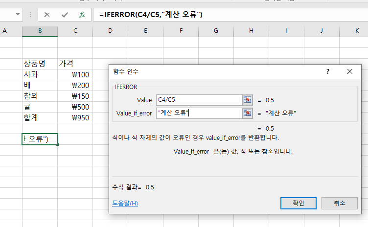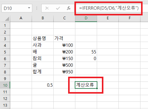 =IFERROR(D5/D6,"계산오류") 라고 수식입력을 했더니 55/0은 잘못된 계산방식이기 때문에 계산오류라고 바로 표시되는걸 확인할 수 있었다.