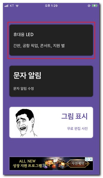 앱을 실행하면 휴대용 LED라고 보이는 메뉴가 있는데 터치한다. 간판이나 공항 픽업할때 콘서트나 다양한 응원문구로 사용할 수 있다.