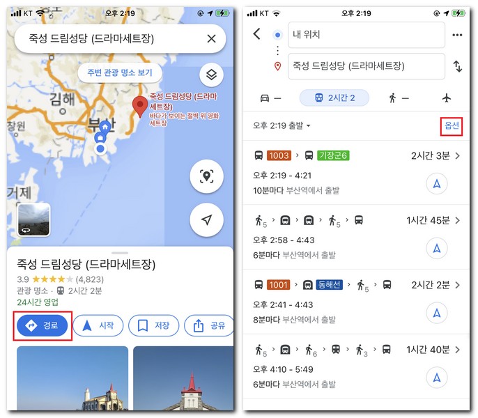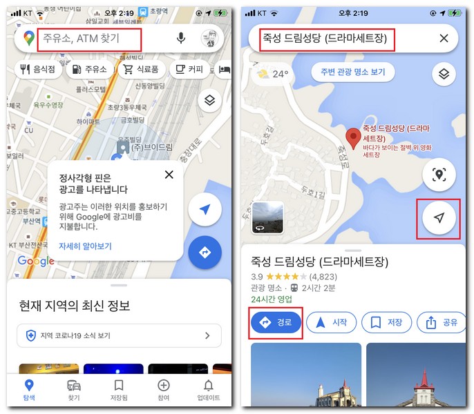 구글지도(구글맵스)를 실행한다. google maps를 실행해서 상단 메뉴에 검색 창이 보인다. 목적지에 대해서 검색을 한다. 필자는 부산 기장의 죽성 드림성당 드라마세트장에 대중교통으로 이동해보고싶어서 검색해봤다.