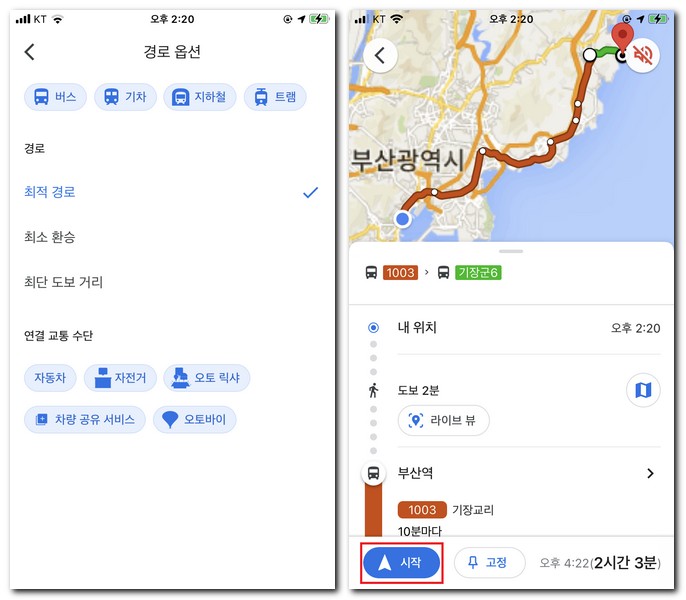 우선 필자가 구글지도를 이용해서 대중교통+도보로 부산 여행을 해봤다. 구글지도 길찾기 사용법은 어렵지 않고 간단하다. 만약 본인이 자가를 이용해서 자동차 길찾기를 하고싶다면 티맵을 개인적으로 추천해주고 싶다.