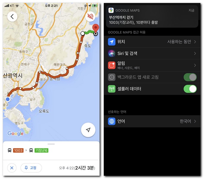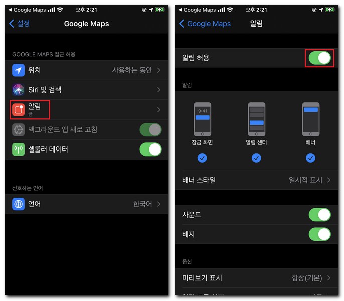 아이폰 google maps 알림이 현재 비활성화(끔)으로 되어 있는데 알림 허용(활성화)로 변경해준다.