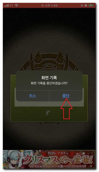 화면 기록을 중단하겠습니까? 라는 메시지가 보이면 중단 버튼을 터치한다.