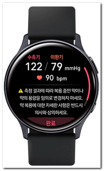 측정이 성공적으로 완료되면, 수축기 혈압과 이완기 혈압 측정값이 갤럭시 워치 화면상에 표기된다.