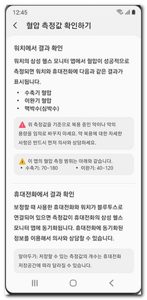 이 때, 갤럭시 스마트폰은 갤럭시 워치의 보정 작업 때 연결되었던 장치여야 한다. 스마트폰 앱으로 전송된 측정값은 의사에게 공유하여 상담 시에 활용할 수 있다.