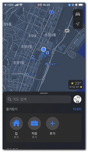 나침반에서 현재 위치의 지도를 확인하려면 화면 하단의 좌표를 터치하면 지도 앱이 열리게 된다.