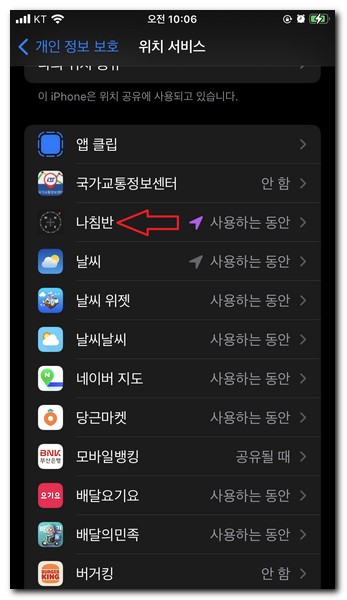 나침반 앱에서 사용자 위치가 정상적으로 보이지 않을 경우 위치 서비스가 켜져 있는지 확인해야 된다.