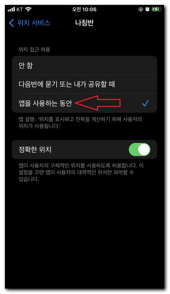 위치를 표시하고 진북을 계산하기 위해 사용자의 위치를 파악할때 사용된다. 안 함으로 표시되어 있따면 앱을 사용하는 동안 위치를 확인할 수 있도록 허용해준다.