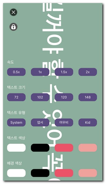 글자 속도와 텍스트 크기, 텍스트유형, 색상, 배경 색상등 기본적인 설정을 변경할 수 있다.
