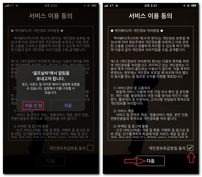 개인정보취급방침 동의에 체크표시하고 다음 버튼을 터치한다.