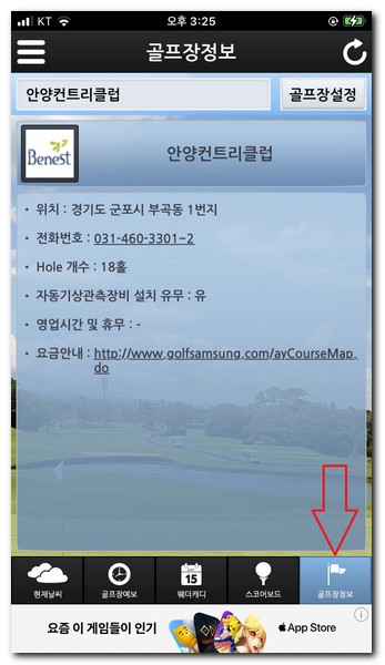 현재날씨 상황에서 골프장 설정이 기본적으로 가평베네스트로 되어 있다.
