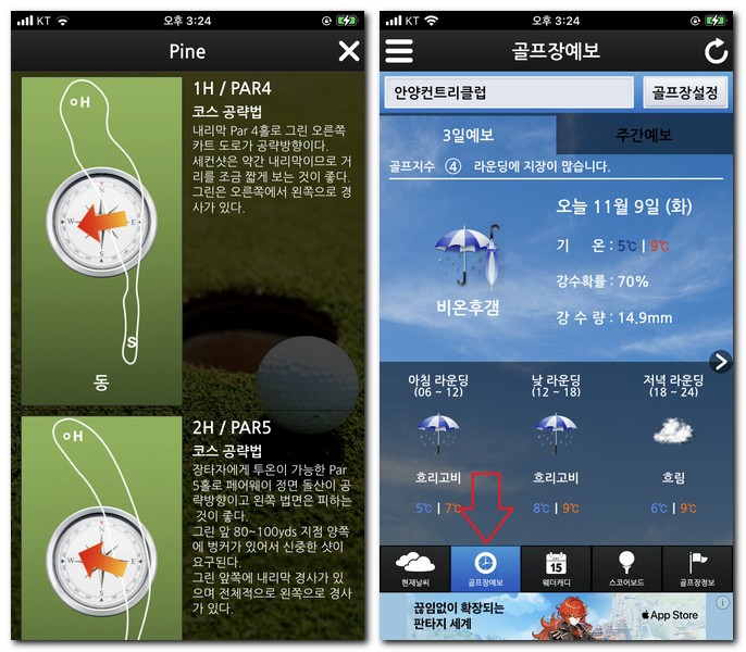 하단 메뉴에서 골프장예보 메뉴를 터치하게 되면 3일예보날씨 상황과 주간예보 날씨상황을 함께 확인할 수 있다.