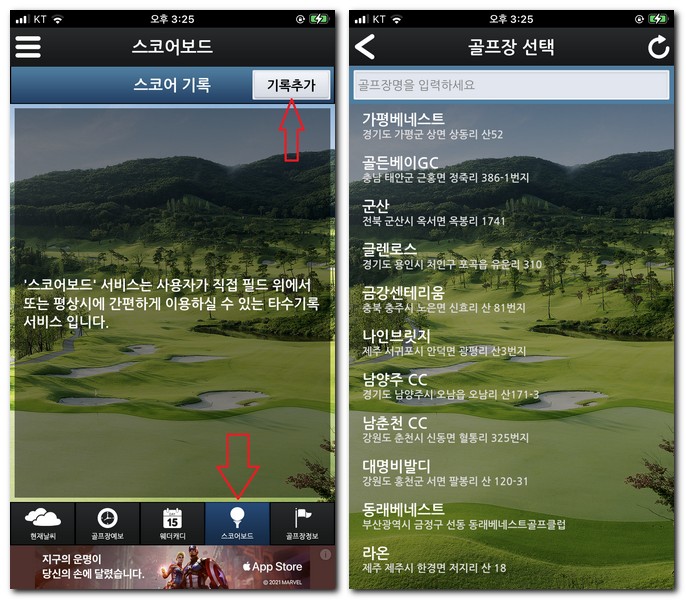 스코어보드에서 기록추가 버튼을 터치하게 되면 직접 내가 필드 위에서 얼마만큼의 타수가 나왔는지 기록할 수 있는 서비스다. 골프장 선택을 통해서 내가 방문한 cc의 리스트에 각각의 타수를 기록해보기 바란다.