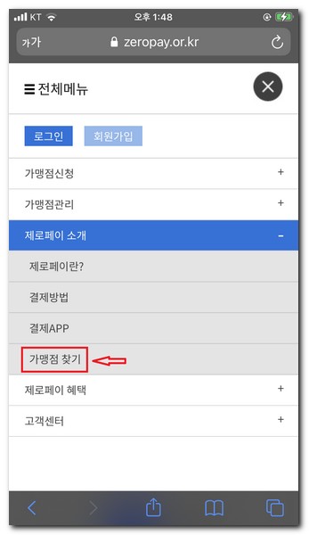 전체메뉴에서 제로페이 소개 -> 가맹점 찾기 터치한다.
