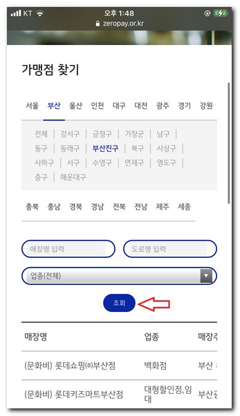 최종적으로 찾은 지역구(구, 군)를 선택하고 조회 버튼을 터치하게 되면 가맹점 매장명이랑 업종, 주소지, 전화번호까지 자세히 검색되는걸 확인할 수 있다.