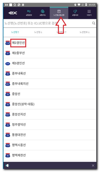 메인 화면에서 상단 메뉴에 노선별교통상황 선택.