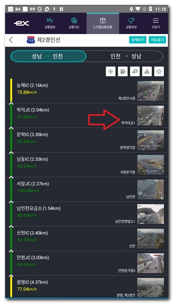 윗쪽 메뉴에서 인천 -> 성남을 선택하면 인천에서 성남까지의 도로교통상황을 자세히 확인해볼 수 있다.
