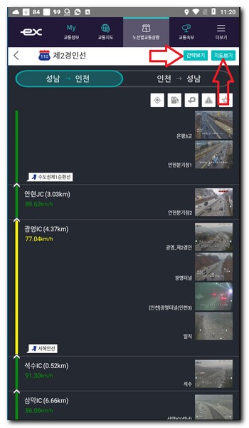 간략보기 및 상세보기 메뉴를 통해서 현재 고속도로 상황을 보다 자세히 확인해볼 수 있다.