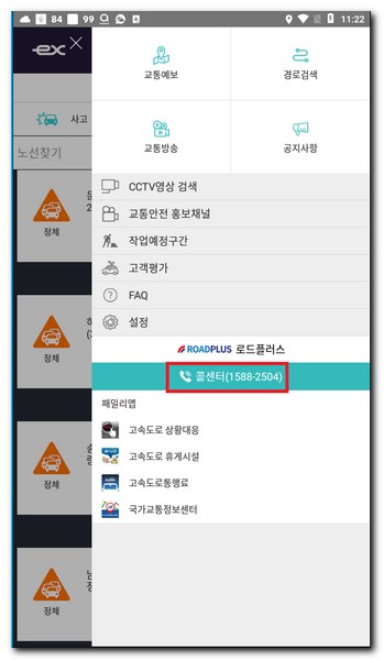 추가적으로 전체메뉴를 터치하게 되면 한국도로공사 로드플러스 콜센터에 연락할 수 있는 고객센터 전화번호(1588-2504)도 함께 기재되어 있다.