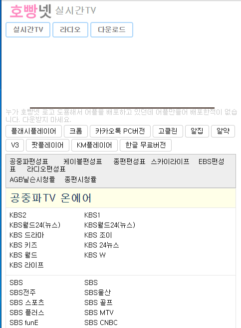 펴늬 실시간TV 사이트는 다소 채널 수는 적지만 그래도 별도의 프로그램 설치는 앱설치 없이도 로그인 없이 TV시청이 가능한 사이트다.