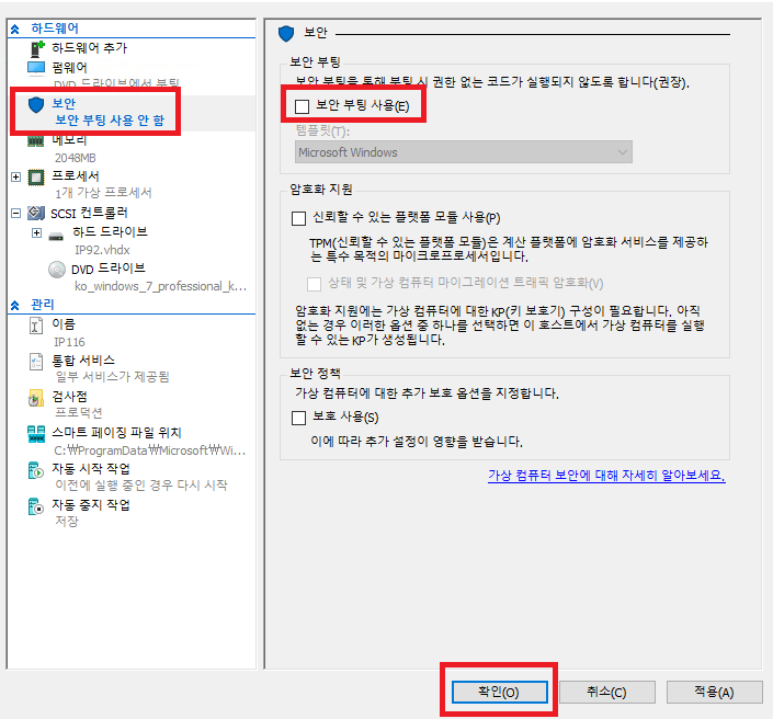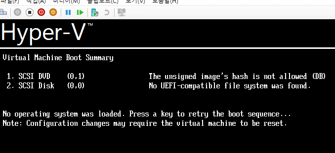 Hyper-v scsi dvd the unsigned image's hash is not allowed 해결 방법