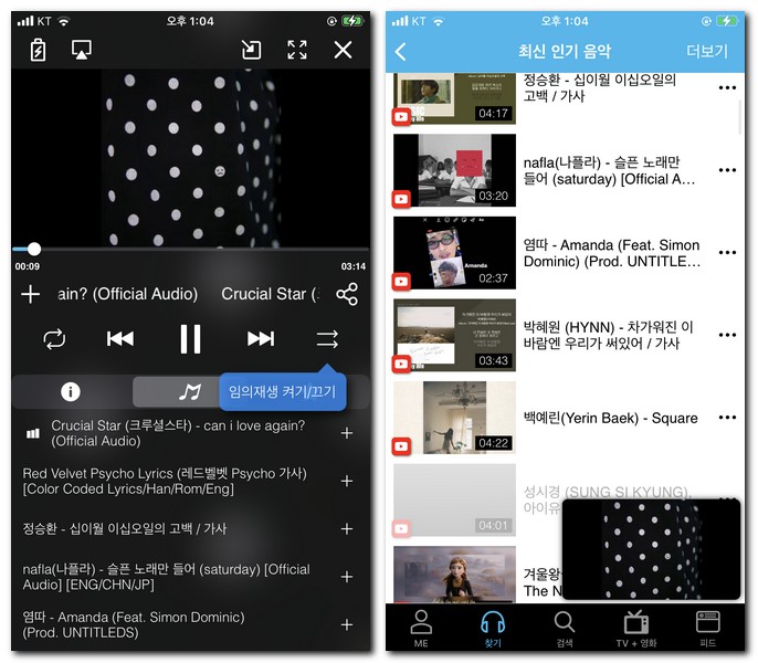 유튜브 뮤직비디오를 시청할 수 있어서 실시간 음악감상도 가능하며 모르는 음악을 찾고 나서 바로 음악 재생이 가능한 점도 장점으로 생각 된다.