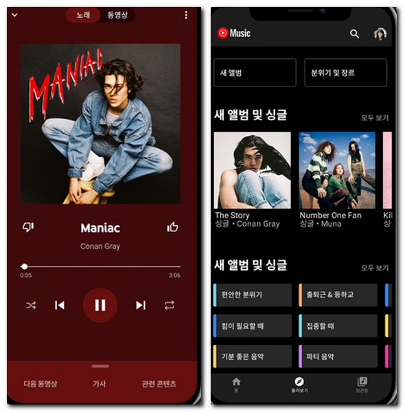 유튜브 음악을 자동으로 재생할 수 있는 유튜브 뮤직 앱이다. 유튜브에는 7천만곡 이상의 굉장히 많은 음악이 있는데, 이 음악을 찾아서 무료로 재생할 수 있다.