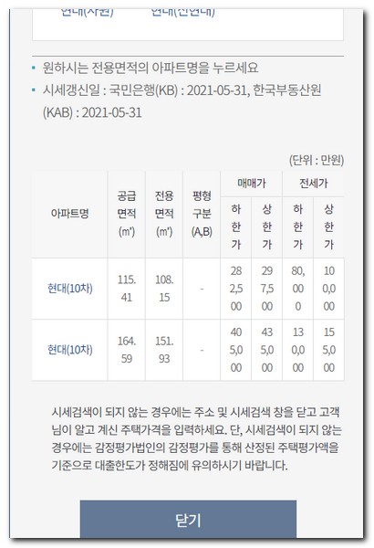 원하는 전용면적의 아파트명을 터치하고 시세 검색을 진행하면 된다. 만약 시세 검색이 되지 않을때에는 주소 및 시세검색 창을 닫고 다시 접속해보기 바란다.