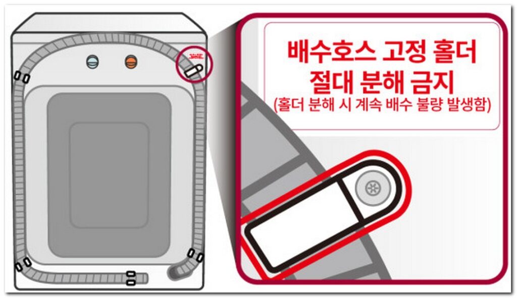 4. 배수호수 고정 홀더를 제거할 경우에는 배수호수의 높이가 드럼세탁기 내 물의 높이보다 낮아져서 물이 자연스럽게 배수될 수 있도록 급수가 진행되더라도 물이 채워지지 않아서 IE에러가 발생하는것이다.