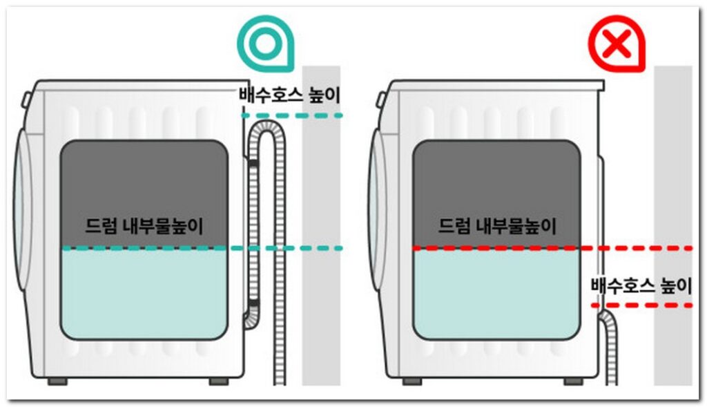 정리해보면 드럼 내부물 높이보다 배수호수 높이가 더 높아야 된다. 그래야 물이 외부로 흘러나오지 않고 안정적으로 유지될 수 있다.