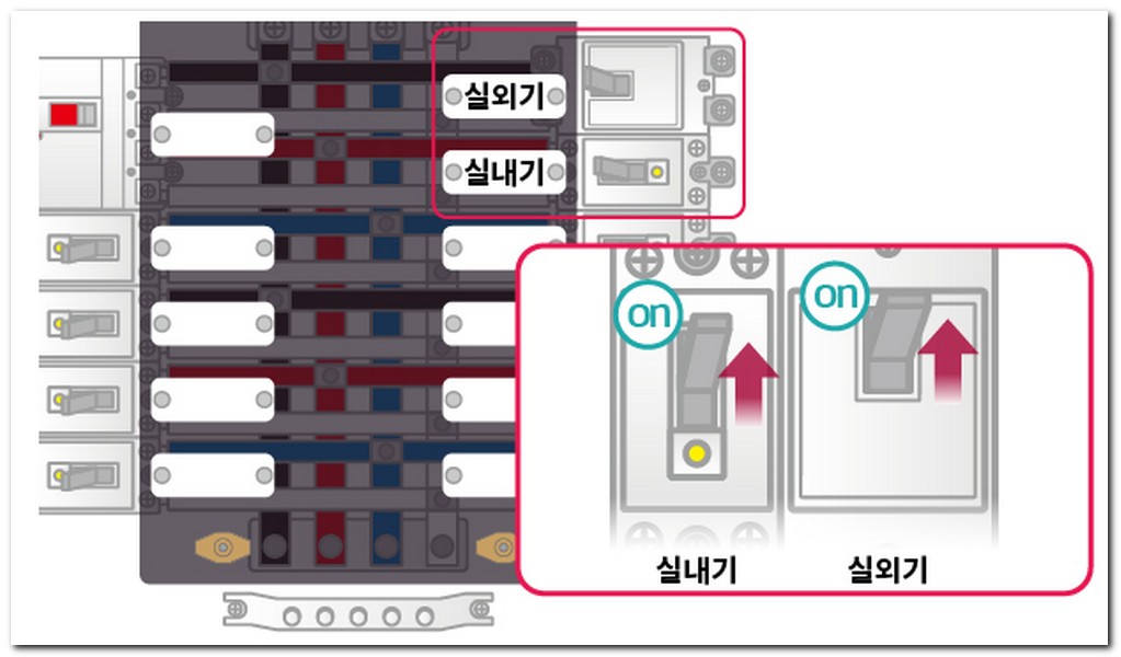 - 실내기 전원과 실외기 전원을 모두 전원차단기를 내린다
