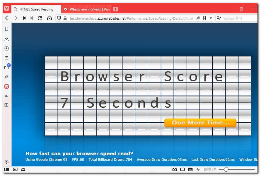 비발디브라우저는 다소 생소한 브라우저이지만 파이어폭스와 더불어서 성능 좋은 점수를 받았다. web3.0에서는 다소 안좋은 점수를 받았지만 BMARK,canvasmark,Canvas Test에서 비교적 좋은 점수를 받았다.