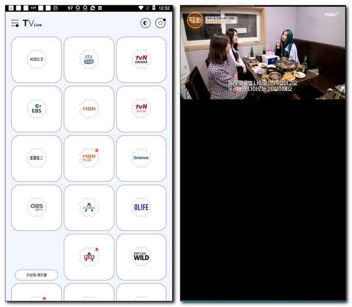블랙티비라는 어플인데 이 어플에서는 mbn프로그램을 볼 수 있는 채널 개수가 총 5개다. 화면이 안나온다면 상단 숫자 부분을 터치하면 채널 번호가 변경된다.