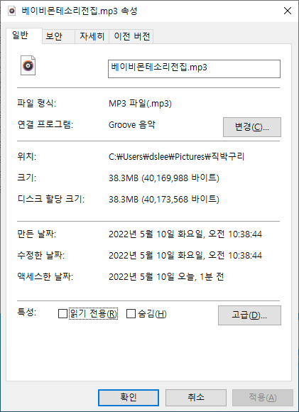 mp3 음악파일이 추가되었으며 mp3 파일에 대한 정보도 자세히 확인할 수 있다.