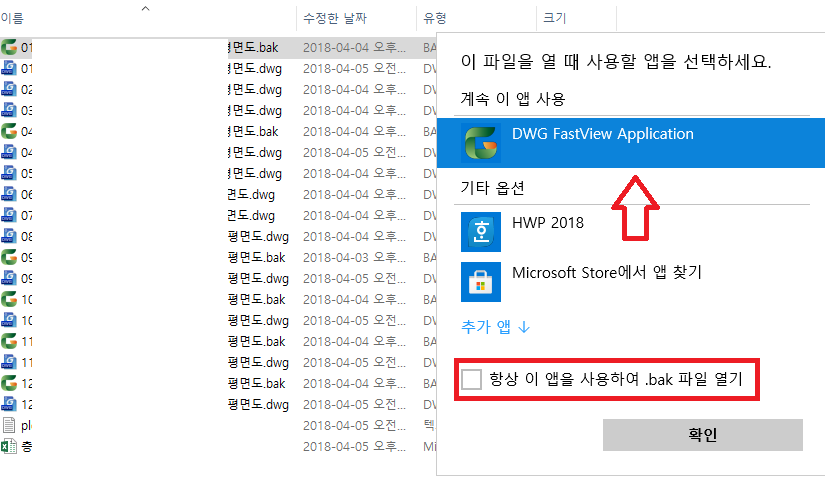 화면과 같이 dwg 확장자는 캐드 도면 확장자 파일이며 bak는 백업 파일이다. 필자는 DWG FastView 프로그램이 이미 설치되어 있어서 bak 파일 열기는 항상 이 앱으로 사용하도록 허용하였다.