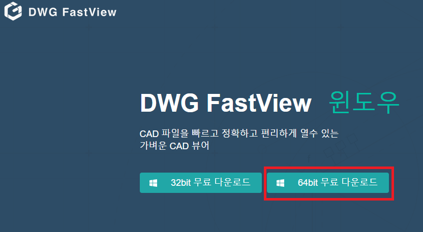 DWG FastView 홈페이지에서 64bit 무료 다운로드를 진행하면 된다. 모바일 버전, 윈도우버전 별로 선택해서 다운로드가 가능하다.