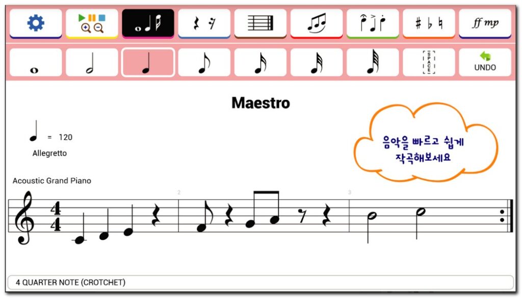 음악 작곡을 할 수 있도록 도와주는 앱이다. 음악을 배우려는 사람들이나 작곡가, 싱어송라이터들이 미리 초안을 만들때 사용하면 될 것 같다.