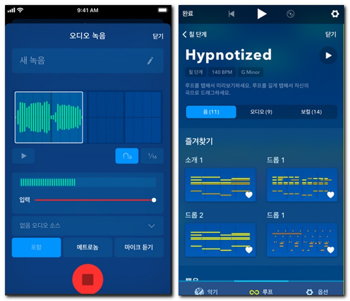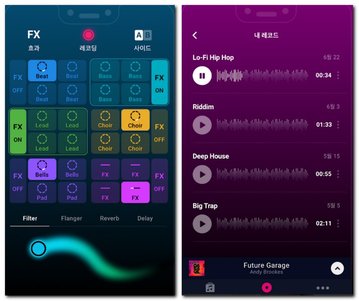 비트 제작을 하고 싶다면 이 앱을 추천한다. 다양한 기본 비트를 제공하고 있고 사용자가 직접 편집에서 만들 수 있는게 특징이다. 초보자들도 쉽게 나만의 음악을 만들 수 있다.