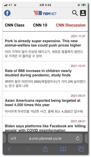 ybmnet이라는 곳인데 이곳에서는 cnn class, cnn 10, cnn discussion이라는 항목으로 각각의 기사에 대해서 실시간이 아닌 녹화방송으로 자막으로 된 영상을 시청할 수 있다.