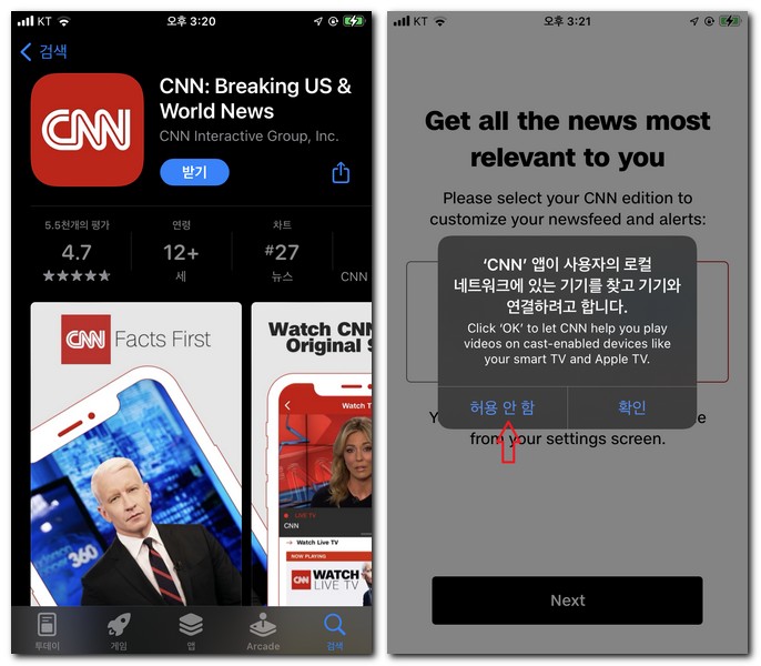 처음 cnn앱을 실행하면 사용자의 로컬 네트워크에 있는 기기에 연결하려고 하는데 허용 안함을 해줘야 된다.