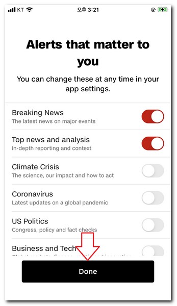받고싶은 뉴스 종류를 선택해서 done을 터치한다.