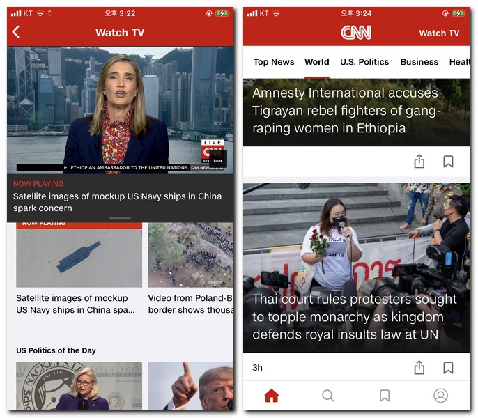 cnn 실시간 스트리밍 뉴스를 감상하려면 cnn 홈페이지에 접속해서는 안되고, cnn 어플(앱)을 다운로드 받아 설치해야만 실시간 스트리밍 뉴스를 감상할 수 있다.