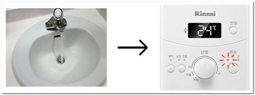 수도꼭지를 온수쪽으로 했을때 온도조절기에 연소상태가 되어 있는지 꼭 확인해야된다. 그리고 온도조절장치에 에러코드가 표시되어 있다면 보일러에 문제가 발생한 경우이다.