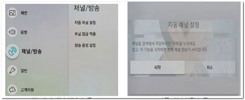 설정 방법 : 리모컨 홈 -> 설정 -> 메뉴 -> 채널/방송 -> 자동채널 설정