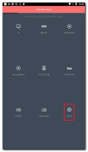 Add New Device에서 에어컨 아이콘을 터치한다.