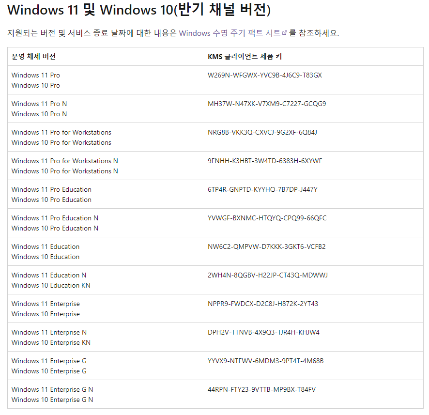 아래는 윈도우10, 윈도우11 무료 정품인증 제품키 정보다.